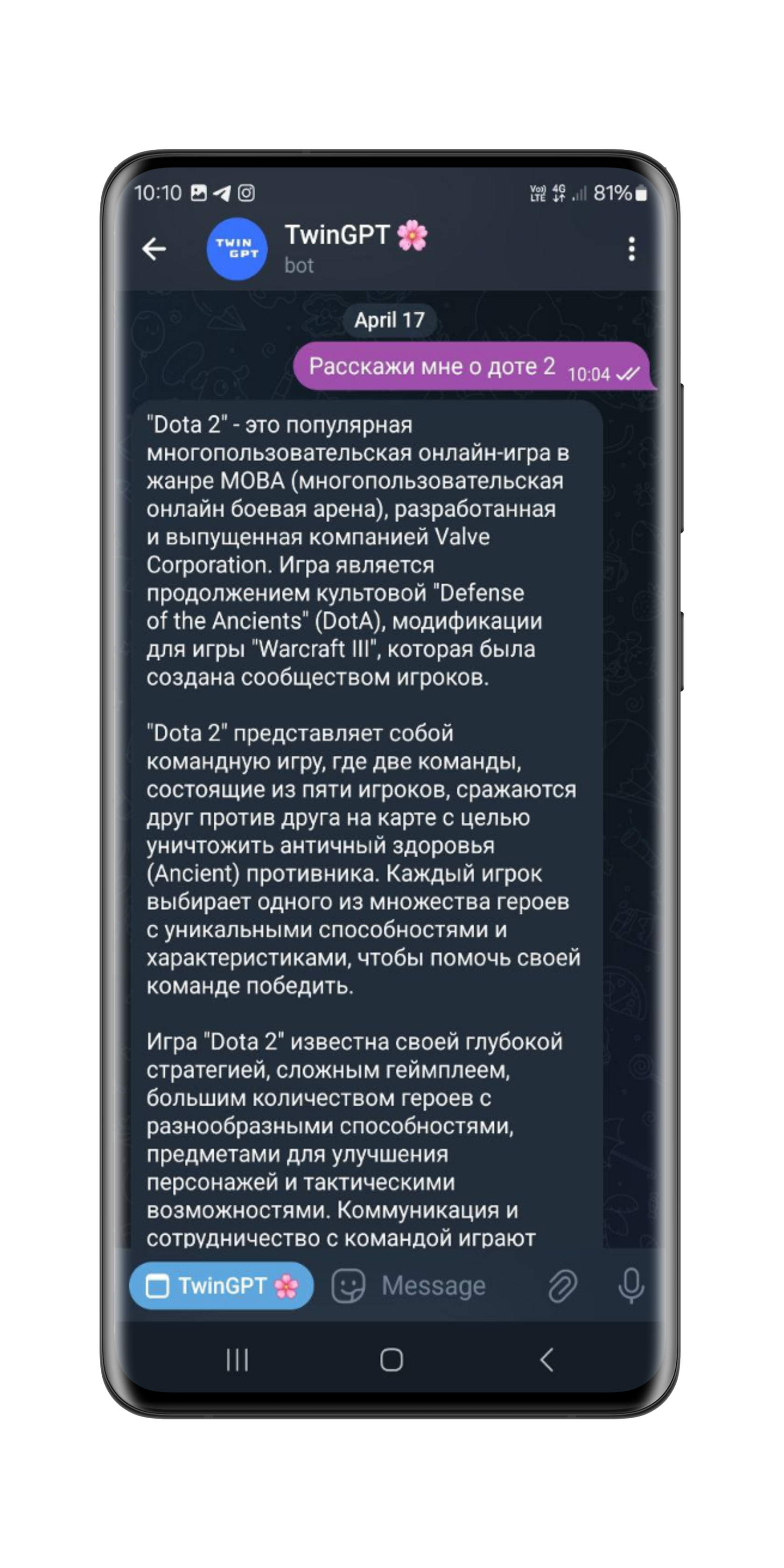 Мы делаем шаг в будущее и зовем тебя с нами! Мы открываем мир нейросетей и предлагаем их нашей аудитории. TwinAI - это аналог нейросетей ChatGPT, MidJourney и голосовых помощников. А если ты никогда не работал с нейронками - мы обучим тебя!